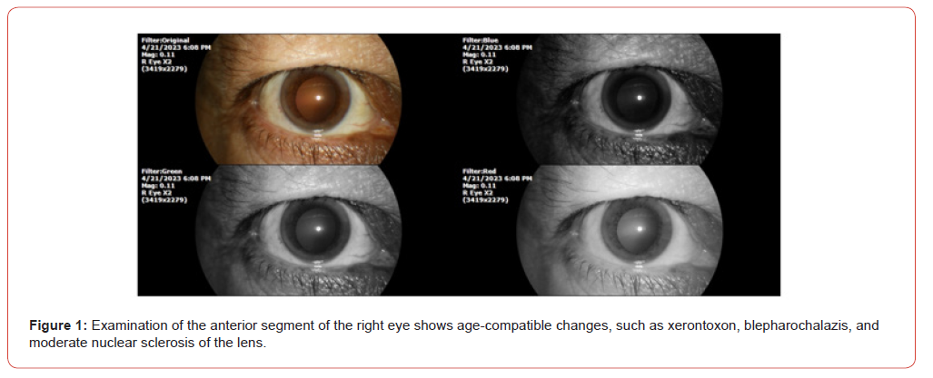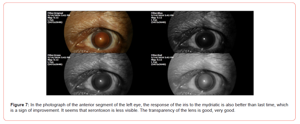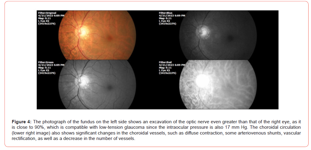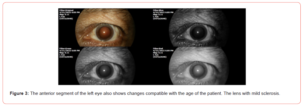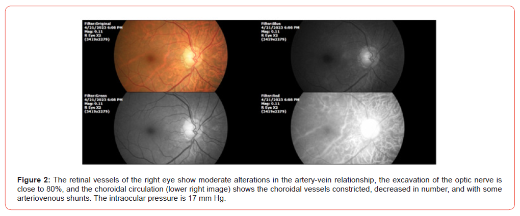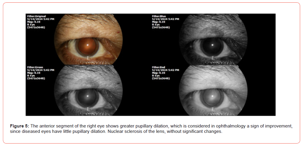 PATIENT NAME: J. V. C. DATE OF BIRTH: 23/11/55 TODAY’S DATE: 21/04/23 GENDER: Male. ADDRESS: Michoacán, México. Phototype V (Fitzpatrick). The patient had been complaining of systemic arterial hypertension since 2010. He has an aorta problem, and since 2019 he has been monitored by a cardiologist. She also refers to intestinal diverticulosis, which causes rectal bleeding, she currently has 8 days of bleeding. The cardiologist’s diagnosis was Aortic valve stenosis. He has dyspnea on medium exertion. The usual studies have been carried out such as Holter, tomography, EKG, etc. His cardiologist saw him every month, he takes Losartan half a tablet every 24 hours. It also refers to stomach pain, severe, like reflux, even vomited. Diarrhoea that was controlled. To the general exploration we have: SpO2 %: 92 %, heart rate of 85 X ' . The ophthalmological examination (4/21/2023) shows the following (Figures 1-4). Once the theoretical basis of our therapeutic approach was explained to the patient and their families, and after the informed consent was signed, treatment was started with QIAPI 1™, sublingual drops, at the dose of three drops every hour, as long as the patient is awake. Given the distance of the patient’s residence from our centre for the study of Human™ Photosynthesis, he was scheduled for a check-up in six months.