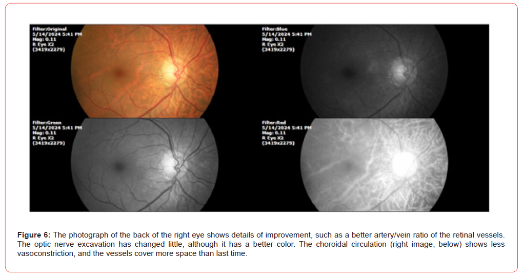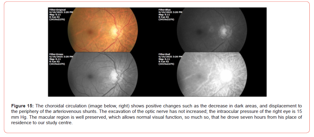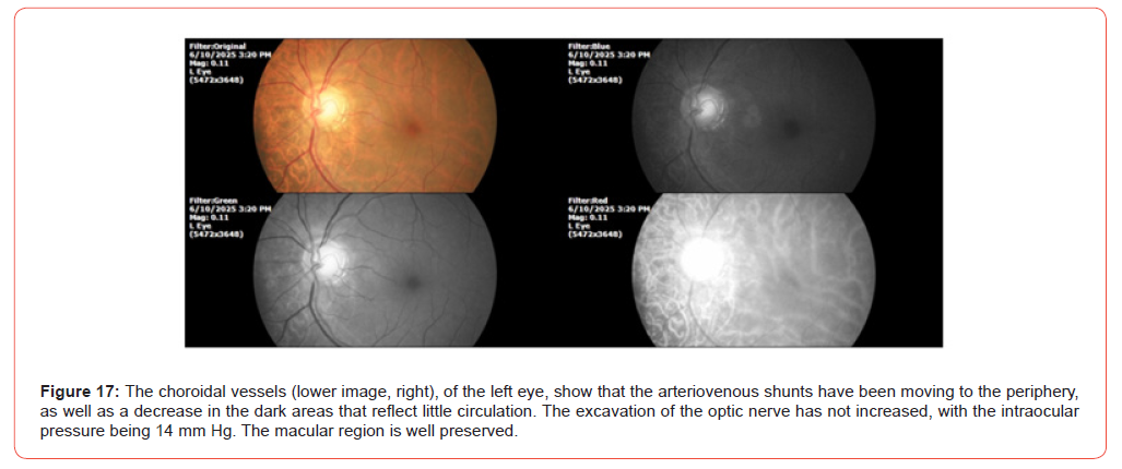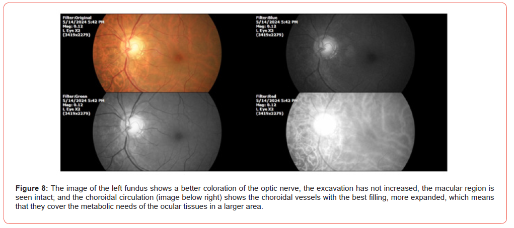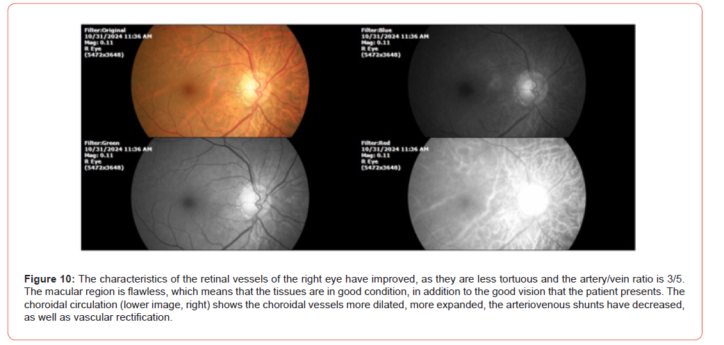 The patient reports that at night his mouth dries out in this hot season. Occasionally his left thumb and left index finger get stuck. As well as the ankle. Breathing is better, now only dyspnea is occasional. He reports occasional, very occasional vertigo. His cardiologist no longer sees him every month, because he tells him that he is better. SpO2%: 91%, and heart rate was 68 x. The following photographs show the ophthalmological findings during the second examination (Figures 5-8). It was indicated to continue with the same treatment, since the systemic symptoms (dyspnea) have improved significantly, as well as the findings of choroidal circulation.