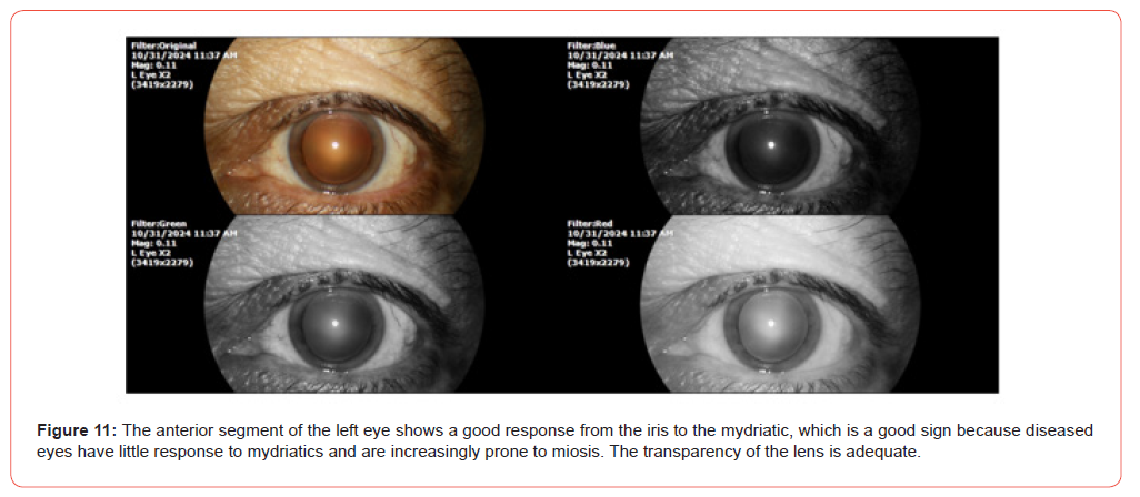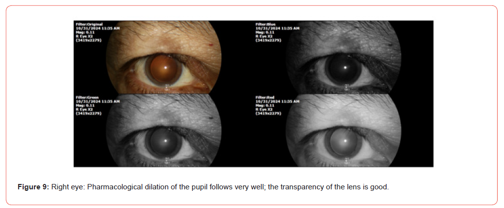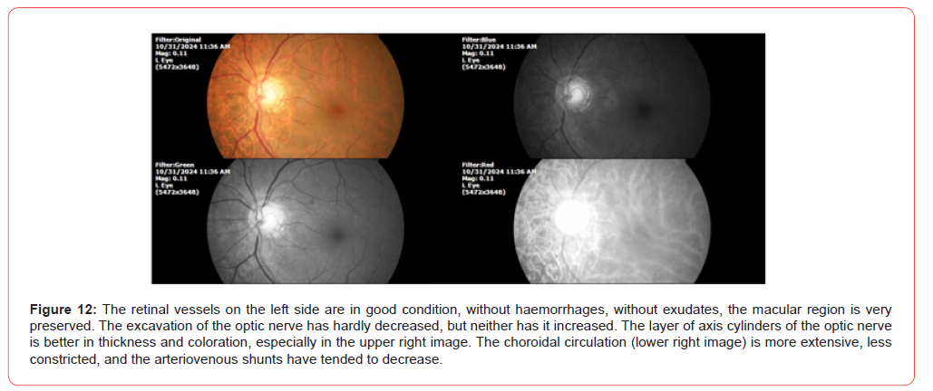 He feels good, like every 15 days, some tachycardia, at night. The cardiologist of the hospital, summon him every six months, before it was every month. The private cardiologist told him that he did not need catheterization or surgery. The CT scans, EKG, good, stable. Episodes of dyspnea and tachycardia are very sporadic and are attributable to a lot of work. The aorta thinned, but it has not become thinner. On general examination, SpO2% was 90%, and heart rate was 58x ́. The findings of the eye exam are shown in the following photographs (Figures 9-12).