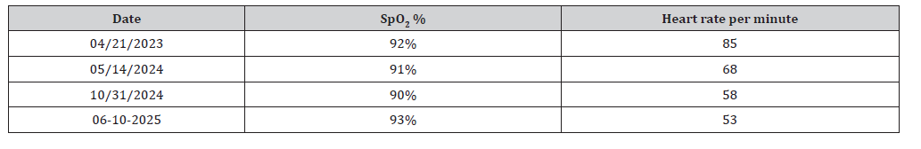 Table 1: The heart rate dropped by just over a third over two years, mostly from 04/21/2023 to 05/14/2024, as there were travel restrictions due to the pandemic. It should be noted that in the last consultation, the patient drove seven hours each way, which tells us about a good level of health.