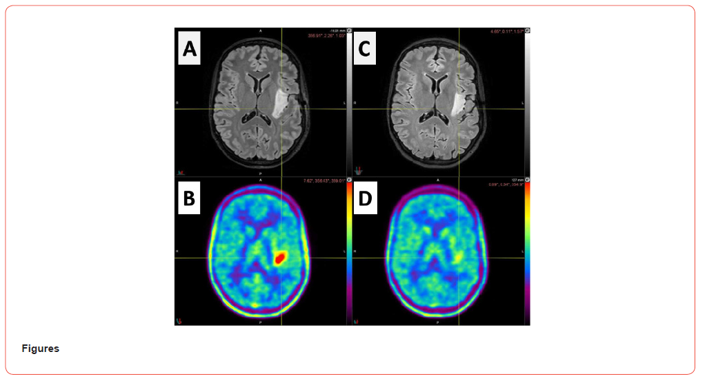 Eleven weeks after the initiation of IDH inhibitor treatment, FET-PET revealed an early, almost complete metabolic response of the residual glioma. After six months of IDH inhibitor therapy, MRI revealed a slight decrease in the FLAIR volume hyperintensity in the left lateral temporal lobe (from 16 cm3 to 12 cm3) (Figure 1C) whereas FET-PET confirmed a maintained metabolic response (Figure 1D). The IDH inhibitor dosage was reduced from 40 mg daily to 20 mg daily because of patient fatigue and an increase in hepatic transaminase levels as revealed by blood analyses. The patient-reported frequency of focal epileptic seizures improved with the use of Vorasidenib. FET-PET imaging appears to be useful for early assessment of the treatment response to IDH inhibitor for patients with residual IDH-mutated glioma.