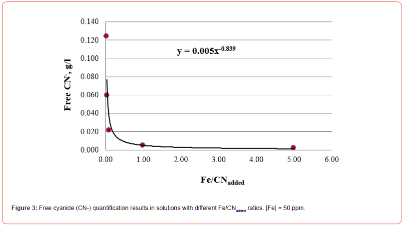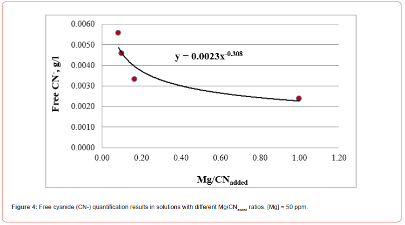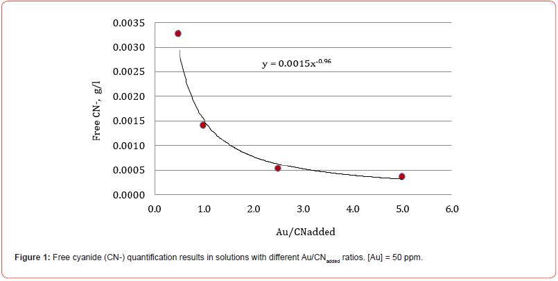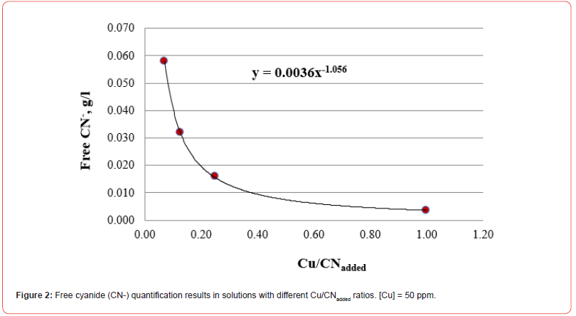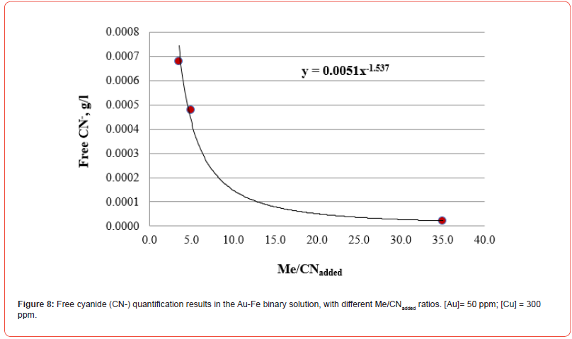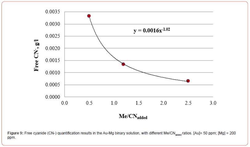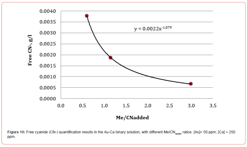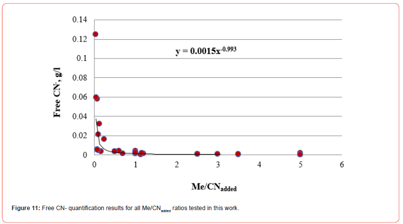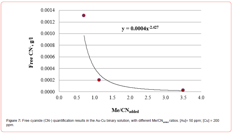 All the Me/CNadded ratios included in this research work are reasonably adjusted to the same function that allows establishing the g/l of free cyanide in the residual solution once the cyanide reacts with the cyanicidal metals contained in the system. This procedure avoids adding excess cyanide that inhibits the dissolution of cyanicidal species by promoting the passivation of the cyanidation reactions of the cyanicidal elements contained, for instance, in a mineral.