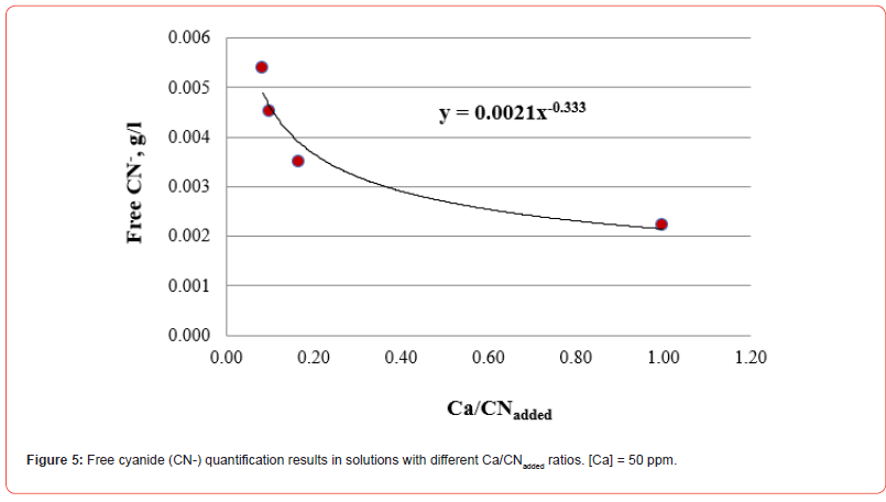 The five figures above show that the amount of free cyanide decreases with the concentration of added cyanide (Metal/CNadded increases). Each figure includes the corresponding correlation equation; with this expression, it is possible to extrapolate the Metal/ CNadded ratio and establish at what value the free cyanide is practically zero (for example, CN- ≤ 0.0001 g/l) and that by subtracting the added cyanide, it results in the quantity of cyanide associated with the metal that forms the corresponding complex. Extrapolating for each system the Metal/CNadded ratio where the residual free cyanide in solution is considered equal to zero if free CN− is equal to or less than 0.0001 g/l, we find that this ratio increases with the cyanicidal character of the metal and agrees with the order of affinity to cyanide suggested by the value of free energy of the reaction, calculated for reactions (2) to (6), and shown in Table 2. From the table above, if the Metal/CNadded ratio increases, it means that less cyanide is required to form the Me(CN)x− complex, as the reaction is more spontaneous, such that the cyanicidal character of the metals agrees with the sequence of cyanide affinity suggested by the results of free energy of reaction for each metal. It is confirmed that the cyanicidal order is Ca → Mg → Fe → Cu → Au.