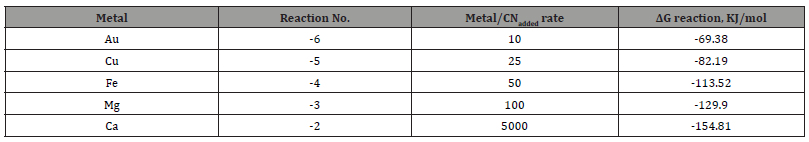 Table 2:Metal/CNadded in deionized water, and the free energies of reactions (2) to (6) of the cyanicidal metals.