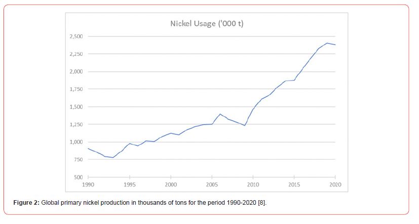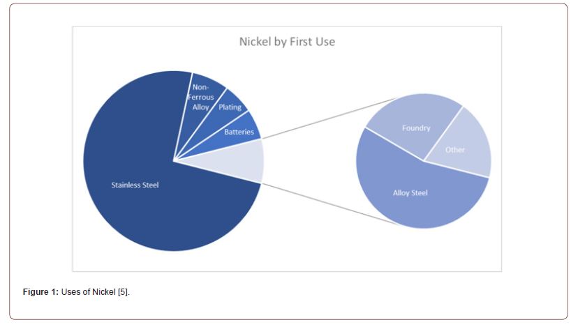 Nickel (Ni) is the fifth most common element on earth and has excellent physical and chemical properties, making it indispensable for hundreds of products. Ni occurs in oxide, sulfide, and silicate ores. The gradual reduction of ore qualities from extensive mining intensifies research efforts to develop more efficient extraction and processing technologies [1]. Significant deposits of Ni also exist in Mn oxides found in the oceans. Recent estimates indicate that such contains deposits more than three hundred million tons of Ni. However, the development of mining technologies in the oceans is needed to enable their use [2]. The five main uses for nickel are developed below [3]: