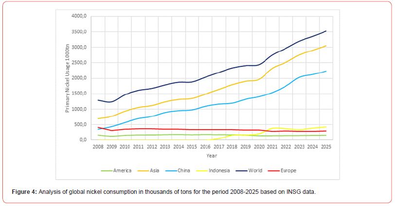 From these charts it is evident that both world production and world consumption of nickel are increasing year by year and that this increase is only due to the production and consumption that takes place in Asia as Europe and America show stability over time if not a slight decline in both production and consumption.