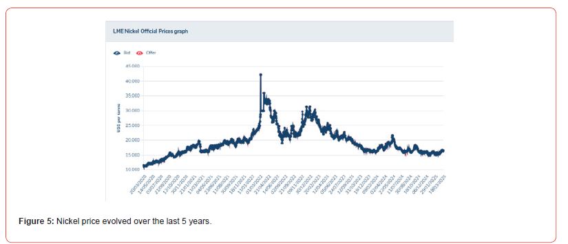However, in 2025, Indonesia, taking into account the gradual decline of the price of nickel in the stock markets, announced that for the next few years it will limit the unregulated laterite mining by about 15%, this is expected to have a positive effect on the price increase due to the limitation of production and market rules (demand/ supply). It is not yet possible to determine the evolution of production and price in 2025 [12]. These developments, based on the latest information, lead either to the closure of large Chinese companies operating in Indonesia, exemplified by PT Gunbuster Nickel Industry, whose Nickel production plant was inaugurated in 2021 [13], or to the acquisition of factories and mines by Chinese companies outside Asia, such as the one owned by Anglo America in Brazil that includes the Barro Alto and Niquelândia mines as well as the units ferronickel production Barro Alto and Codemin, whose production in 2024 was 39,400 tn of nickel. factories from China-backed MMG Limited [14].