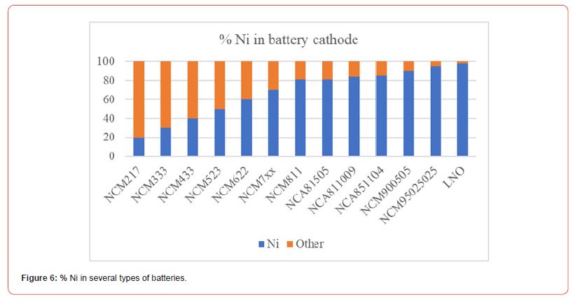 The interruption or reduction of nickel production in various parts of the world is due to the stabilization of the price at low levels below the cost of production of companies and various geopolitical developments that have led to the increase of prices in energy in the Western world. The following figure shows the evolution of the nickel price in recent years [10]. As for Ni amount used to produce batteries, it is known to increase rapidly. Ni is used in several types of batteries. The use of nickel in lithium-ion (Li-ion) batteries, due to the high energy density of Ni- containing cathodes, has increased significantly in recent years, and this increase is expected to continue. Figures 5 & 6 shows the % of Ni in several types of batteries [8]. In a recent publication the Nickel Institute [11] reports that as the electric vehicle industry continues to grow, nickel’s role in battery technology is becoming increasingly apparent. From the high-nickel cathodes used by Tesla to LGES’ high-voltage medium-nickel cathodes, nickel is at the core of innovations that promise to extend range, improve efficiency, and reduce costs. At the same time, advances in safety additives, alternative chemicals like NiZn, and the push towards solid-state batteries offer a glimpse into the future of safer and more efficient EV batteries.
