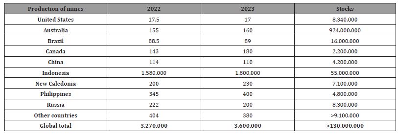 A good picture of global production can be presented based on the survey of the statistical service of the USGS National Ore Information Centre (United States Geology Survey), which records the global production of nickel ores for the years 2022 and 2023, as well as their estimated reserves. The data from this survey are presented in Table 1 [6]. As far as Greece is concerned, mining activity stopped in 2022, while based on LARCO data, the reserves as presented in the company’s 2018 inventory report, the measured – indicative resources with those used as optimal for the mines Cut Off Grades 0.80% for the ores of Ag. Ioannis and Evia and 0.90% for Kastoria ore, are estimated at 99,512,000 tn with an average nickel content of 0.95%.