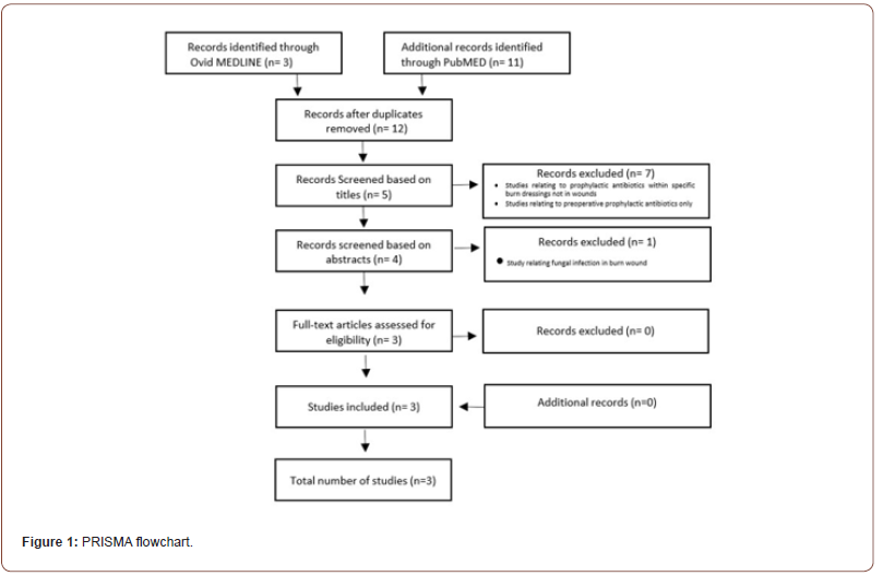 Ramos et al. [7] analyze systemic antimicrobial prophylaxis in burn patients. The main objective of this systematic review was to review studies relating to systemic antibiotics in burn patients. A key finding was that antibiotic prophylaxis might be effective in prevention of graft loss however there is poor evidence relating to use of antibiotic in graft loss (Figure 1).