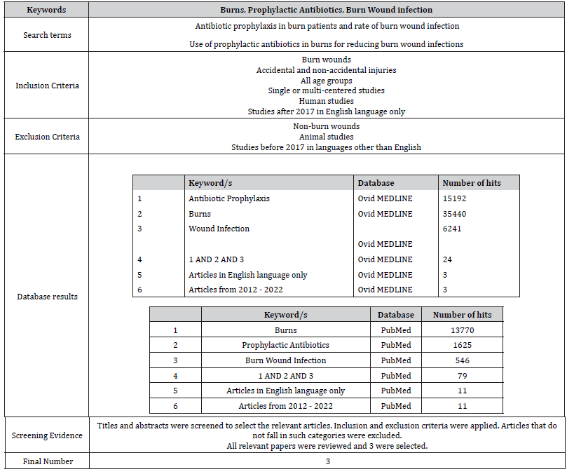 In view of this, a literature review was carried out relating to available literature about antibiotic prophylaxis in burns. The aim of this review is to analyses rates of burn wound infection rates when using prophylactic antibiotics. Secondary outcomes include assessing the length of stay in intensive care and mortality rates in these patients. The aim was set according to PICO framework as illustrated in Table 1.