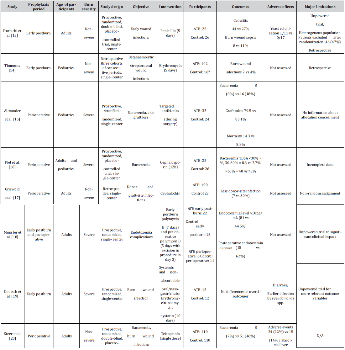 - Ramos G, Cornistein W, Torres Cerino G, Nacif G (2017) Systemic antimicrobial prophylaxis in burn patients: systematic review. Journal of Hospital Infection 97(2): 105-114.