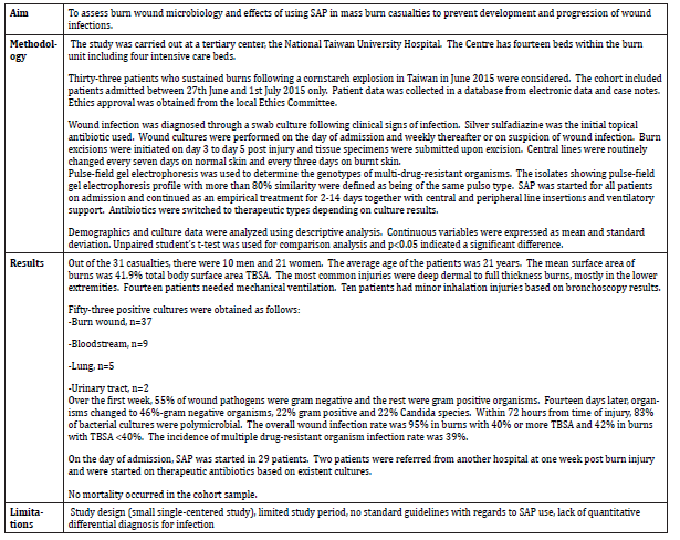 Yeong et al [12] describe the wound microbiology and the outcomes of the systemic antibiotic prophylaxis in a mass burn casualty incident. Thirty-one patients treated at a tertiary hospital in Taiwan in 2015, following a cornstarch explosion, were considered in this retrospective study. The authors analyzed the wound microbiology and effect of SAP of patients involved in this incident. They looked at wound infection rate, type of wound pathogens and rate of blood stream infections [22-30].