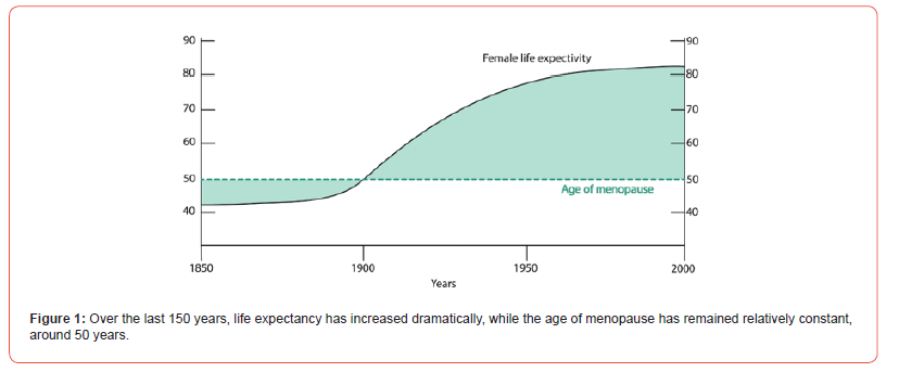Although life expectancy has dramatically increased over the last century, reaching around 85 years for women, the age at menopause has remained relatively constant at about 50 years [1]. Besides their reproductive function, the ovaries play a major role in the secretion of female hormones and, therefore, are involved in various homeostatic processes. With the advent of new technologies that extend people’s lives, we now face an increase in the number of years during which women live in poor health (Figure 1). Thus, reproductive aging is not only relevant from a reproductive standpoint but also for the overall health of women in the second half of their lives.