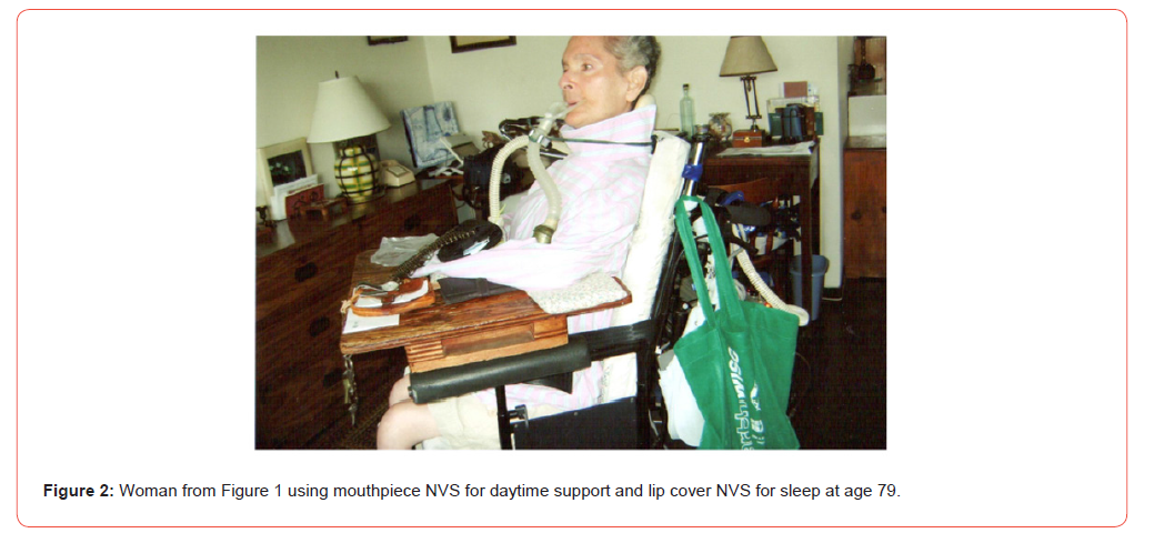 Home mechanical ventilation became possible since electricity became widely available around 1930. However, the predominant body ventilator available from 1930 through 1952 was the 400 kg Iron Lung. Its absence in Denmark in 1952 led to tracheostomies being placed for TMV. This spread to the United States and permitted polio patients to leave Iron Lungs for wheelchairs. Then, in 1953, Dr. John Affeldt described NVS via TygonTM “straws” (Saint-Gobain Performance Plastics, Wayne, N.J.), scuba, and other mouthpiece/ oral interfaces, instead of tracheostomies in Rancho Los Amigos Hospital in Los Angeles [5]. Rancho was one of 16 rehabilitation centers for Iron Lung users in the United States [6]. In 1957 Dr. Augusta Alba switched almost 200 patients post-poliomyelitis (PPSs) and patients with muscular dystrophies, high level spinal cord injuries, and other causes of ventilatory pump failure, from Iron Lungs to mouthpiece CNVS (Figure 1) [7]. Ultimately, lip cover phalanges (LipsealsTM, Life Care Inc., Colorado) were used for support during sleep, for some, now, for 70 years (Figure 2).
