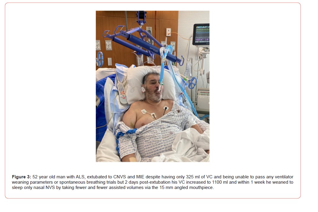 In 1988, extubation criteria were developed for patients who can not pass ventilator weaning parameters or breathing trials, to be extubated to CNVS and MIE. They include being fully alert, having no visceral organ failure, fever, or signs of infection, low to normal blood CO2 levels on ventilatory support, and having O2sat normal in ambient air MIE being used via the tube every hour or so until this is the case. One can then be extubated CNVS and MIE at NVS settings and physiologic back-up rates and always without supplemental oxygen. Upon mastering nasal ventilation, they are then trained in mouthpiece ventilation [1,2]. Using this approach, none of our myopathic, dystrophic, or lower motor neuron disease patients at any age have required tracheostomies, many even with 0 ml of VC, and some presenting using CTMV even decannulated since 1969 [17]. Following tube removal, patients often wean from the ventilator by taking fewer and fewer positive pressure ventilations (Figure 3) and, because the tubes are removed, their VCs increase. With VC over 250 ml they at least partially wean CNVS. Although there is no more risk of harm to speech or swallowing by being intubated over 3 weeks as there is under 3 weeks [4], if postextubation paroral feeding is unself, gastrostomies are performed under local anesthesia.