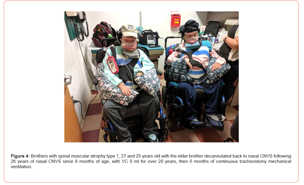 In 2010 the centers also presented 41 children with SMA type 1 dependent on CNVS instead of CTMV for a mean 5.9±1.8 years [12]. Today, there are over 80 CNVS dependent with SMA1, 22 between 20 and 30 years old. All are CNVS dependent since as young as 3 months of age with none having any functional muscle activity other than eye movements and most with 0 ml of VC.