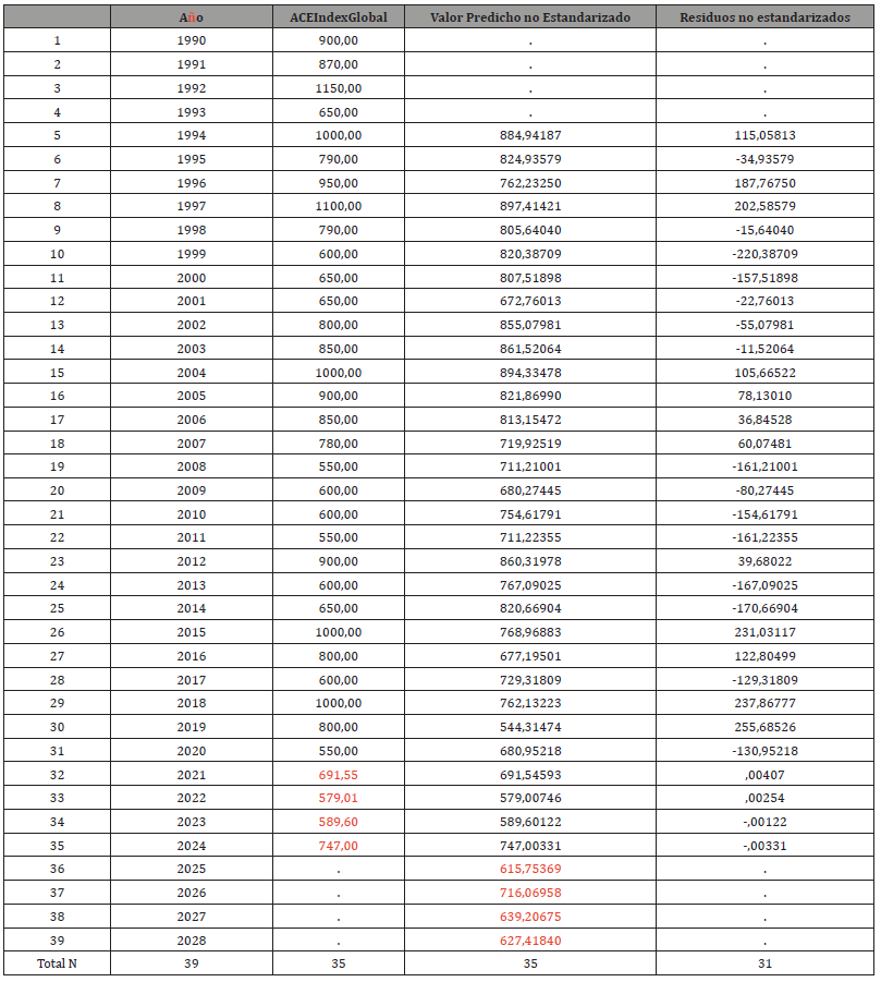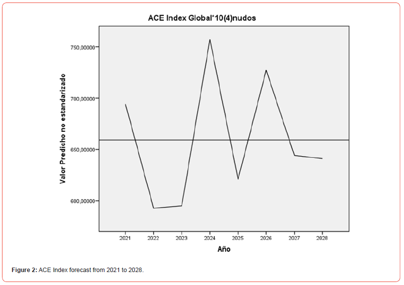 To carry out this work, a database of the Accumulated Energy Index (ACE Index) was used from 1990 to 2020, according to a graph created by the authors obtained from the website of the National Meteorological Institute of Cuba (www.insmet. cu), (Figure 1). This Index was modeled with the help of the ROR8-19 methodology, and then a long-term forecast was made. First, this Index was modeled with the help of the ROR methodology, and then a long-term forecast was made until the year 2024. Subsequently, the forecast data was included and the model was run predicting until the year 2028.