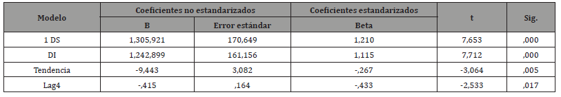 The model in question is the following, Table 2. All variables are significant, DS is the sawtooth variable, DI is sawtooth but inverted, the tendency of the Index is to decrease, and the model depends on the returned Index. in 4 years (Lag4), which may be related to the occurrence of the ENSO Event, which has a similar frequency.