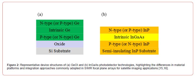The primary advantage of the GeOI platform lies less in a singular detector performance metric and more in its alignment with CMOS manufacturing and integration paradigms. The presence of the BOX layer provides effective electrical isolation from the Si substrate, suppressing parasitic leakage paths and supporting low-noise operation. More strategically, the use of Si-compatible substrates and process flows opens a route toward co-fabrication of photodetectors and electronics within a unified technological framework. Such compatibility has important implications for future satellite payloads. Monolithic or near-monolithic integration can reduce interconnect parasitics, lower assembly complexity, and potentially improve robustness in vibration- and radiation-prone environments. At the same time, it is essential to recognize that mature InGaAs technologies continue to evolve and will remain indispensable for missions requiring maximum sensitivity and proven heritage. In this context, GeOI should be regarded as complementary, addressing application spaces where manufacturability and integration outweigh the need for absolute performance optimization (Figure 2). The Ge/GOI technology has been demonstrated in laboratory-scale SWIR imaging and smallformat array prototypes [14].