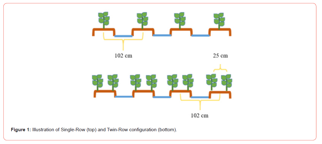 The soybean cultivar ‘Credenz 4748 LL’ was seeded into conventionally tilled plots measuring 4.06 × 30.48-m at 258,300 seed ha-1 to represent the medium planting population (MP) and 387,400 seed ha-1 to represent the extra high planting population (EHP) via John Deere Max Emerge 2 planter (John Deere, Deer and Company, One John Deere Place Moline, IL) for the SR system. A Twin-Row Monosem planter (Monosem Inc. 1001 Blake St. Edwardsville, KS) was used to plant each population in the TR system. Each plot consisted of four beds spaced 101.6 cm apart separated by a perpendicular alley 5-m across (Table 1 for treatment layout and Figure 1 for row configuration design). Replications were established down the slope based on drainage and irrigation direction.