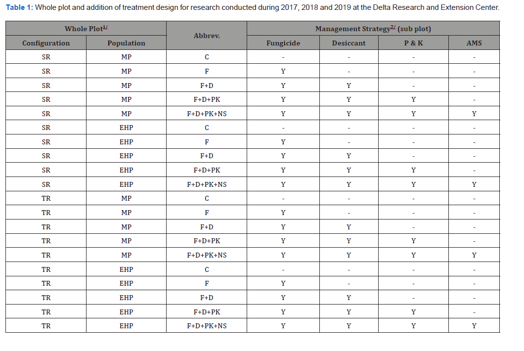 Two strategies to manage disease pressure have emerged recently: i) scout for disease pressure, then make the appropriate fungicide application or ii) make a blanket (automatic) fungicide application at the growth stage (R4). Allen [1] concluded that any application made before R4 will not result in season long residual activity. Results also showed that 50-60% of the time fungicide provides a break-even response when applied at R3 to R4 under a high yielding environment. Timing for the harvest aid application to soybean production application is critical. Timely application allows the producer to harvest 3 to 14 days sooner when compared to an untreated crop if applied at growth stage R6.5 and environmental conditions are favorable [2,3]. However, desiccation application too early in the growing season can also reduce yield. Boudreaux [3] concluded that application of desiccant before the soybean growth stage (R6.5) had the potential to reduce yield by 17%. If harvest aid is applied and harvest occurs in a timely manner then no yield loss, grain weight decrease, or quality can be affected [4-6]. Whigham and Stoller [6] concluded that paraquat shortened the days until harvest when compared to other desiccation herbicides. Paraquat had a slight effect on seed germination, loss of seed weight, and yield loss was greatest when compared to other herbicides. However, when applied 14 d before harvest there was not a significant difference between treated and untreated plots.