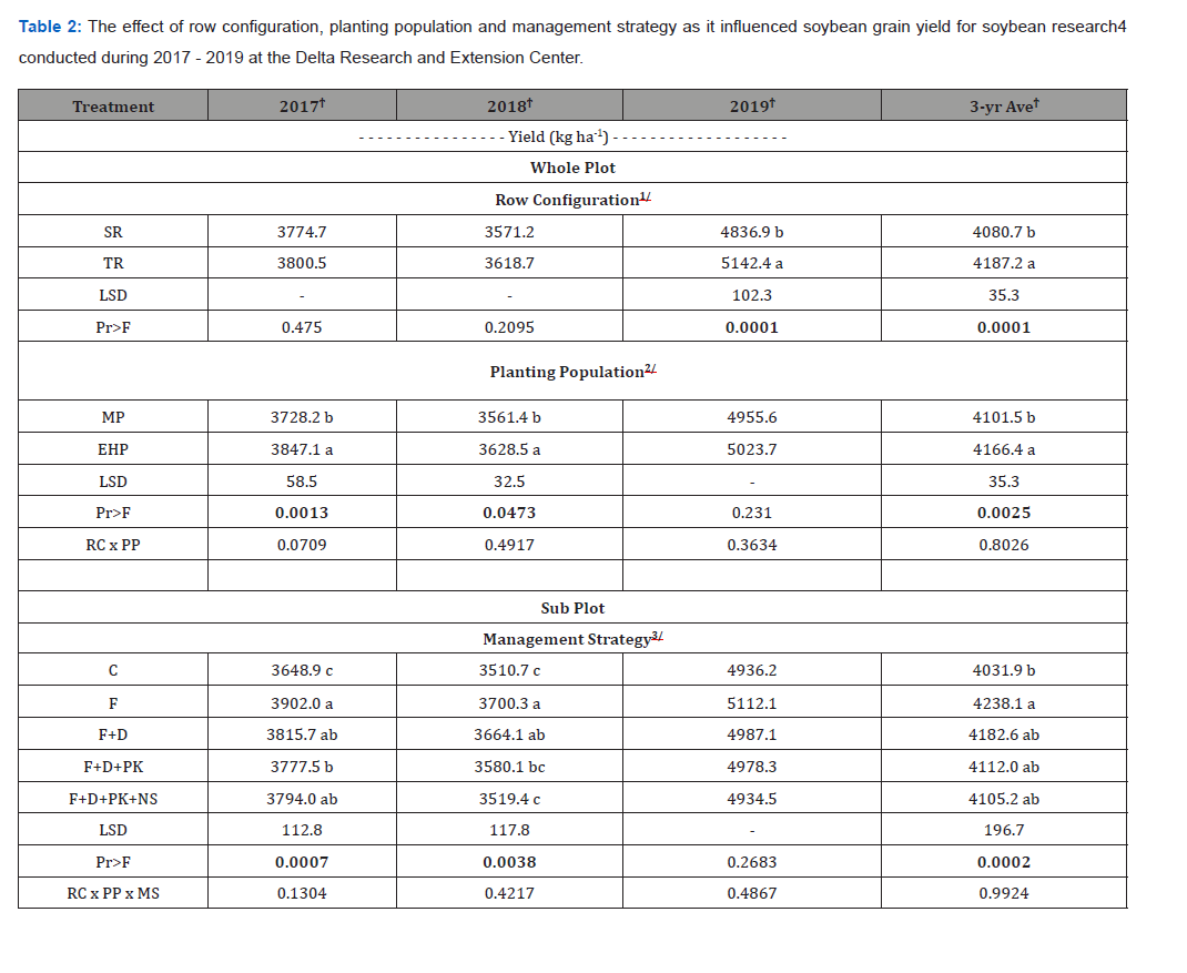 In 2017, 2018, 2019 and 3-yr average, differences in soybean grain yield when comparing EHP population to MP population was 3.1, 1.8, 1.4 and 1.6%, respectively (not significant in 2019). Stivers and Swearingin [12] reported that small skips in soybean stand will not reduce grain yield. However, large skips do have the potential to reduce grain yield. If a thin stand is uniform early, soybean can compensate and similar yields can be achieved over a large range of soybean populations [13-16]. In 2019, averaged across both populations soybean grain yield was 27.9% greater when compared to 2018.