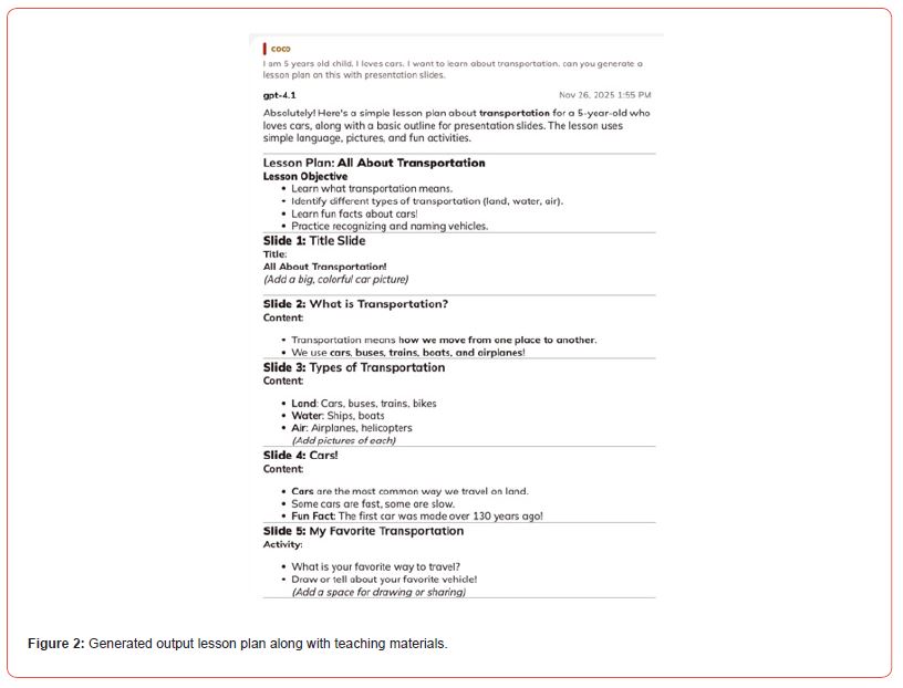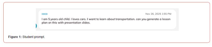 Generative AI facilitated brainstorming, material creation, and lesson adaptation. Participants used ChatGPT to generate story prompts, rhyming songs, science experiments, and math games, demonstrating its creative use in early childhood education [32,33]. Canva AI, Yochatgpt and DALL·E made it easier to produce worksheets, flashcards, and illustrations, but teachers still needed to check the materials [34]. Teachers also used AI to adapt stories to different language levels and to tailor science activities to students with varying abilities, which aligns with research on AI-supported personalisation [35]. Participants stressed the need to review AIgenerated materials for accuracy, cultural relevance, and suitability for young children. Figure 1 shows the student prompt, and Figure 2 shows the generated lesson plan along with teaching materials.