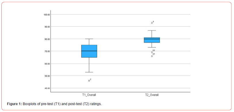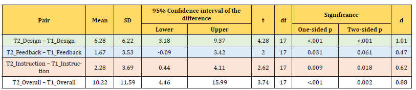 Table 2:Results of the parted-samples t test of the pre-test (T1) and post-test (T2) by the three aspects and overall ratings.