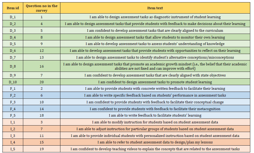 To study the impacts of the teacher development project on participants’ AL, we developed a survey instrument composed of 20 items to cover three aspects: (1) design of assessment tasks, (2) providing students with feedback, and (3) instruction based on assessment data.