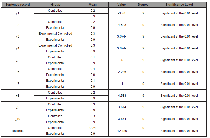 To answer the second research question, “Is there any statistically significant difference at the significance level (α ≥ 0.01) between the control group and the experimental group in developing sentence reading skills?”, the differences between the records of the control and experimental groups were identified across all sentences. A t-test was used for related groups to determine whether there were statistically significant differences at the significance level of 0.01 between the control group and the experimental group in developing sentence reading skills.