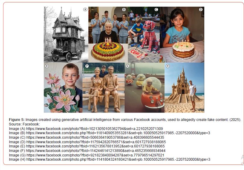 This simplicity in the use of artificial intelligence has made it easier to generate fake content than authentic content; it is no longer necessary to obtain or try to find a real image to support a text; today, both the image and the text can be artificially created. Social media spread images and videos generated by artificial intelligence on a daily basis—synthetic images that, for the most part, do not warn or inform the user of their origin or authorship. For example, many social media accounts use images that are not real, yet are presented as truthful, as a claim. They are sometimes accompanied by text that reinforces the image or seeks to appeal to primal emotions. These images, by provoking an emotional experience in the subject, allow a rapid and deep identification with the message they transmit, as well as a resistance to the arguments that might want to question them [4]. In this way, contents are created that are false, intentional lies that are not detected by the user and that, in turn, are shared. The proliferation of this type of deceptive content is alarming.