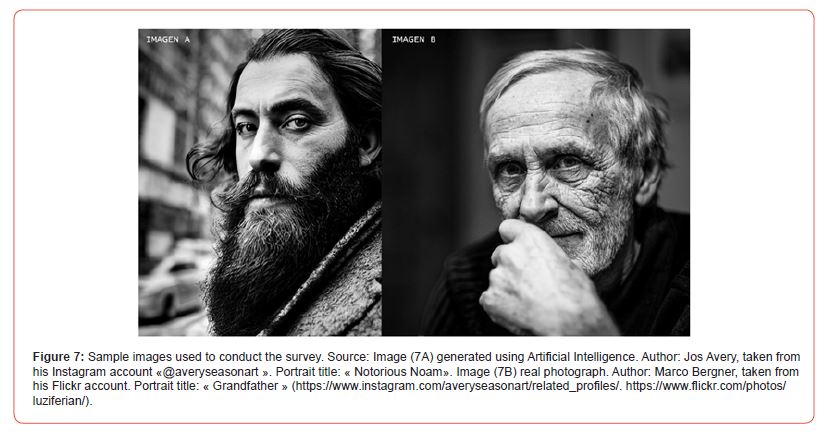 For the study, two similar images (Figure 7) were selected, each showing black and white portraits of two different people. The first image was created using artificial intelligence, while the second image is a real photograph. The “authorship” of the first image (7A) is attributed to Jos Avery, who became popular for showing on his Instagram account (@averyseasonart) numerous spectacular black and white portraits created using the artificial intelligence program Midjourney and subsequently retouched by him, without revealing the origin of the images (he even stated on his account that he had used a Nikon D810 to take the photographs), which were not recognized as artificial by his numerous followers. The second image (7B) belongs to Marco Bergner, a current self-taught German photographer who shows his work through Flickr, a website that allows storing and sharing photographs, and his website (https:// mbergner-foto.de/).
