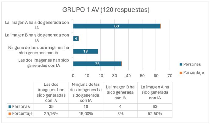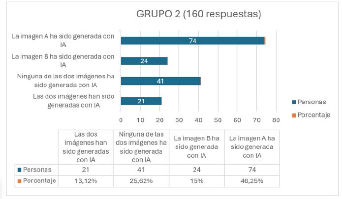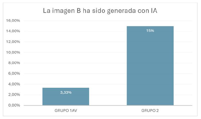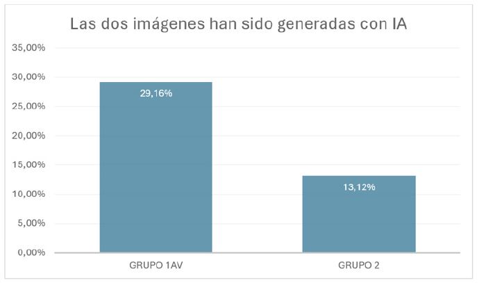 Regarding the third alternative presented, where we propose that neither of the two images has been generated through artificial intelligence, 15% of group 1 AV considers that both images are real, while this percentage rises to 25.62% in group 2. In this sense, this difference of just over 10 percentage points shows that group 2 is slightly more confident than group 1 AV about the legitimacy of both images (Table 3).