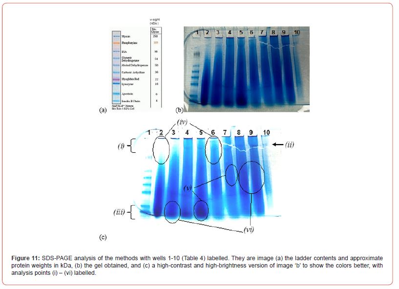 The molecular weight (MW) of keratin is crucial for forming effective filaments. Various extraction methods were analysed via SDS-PAGE. The well contents in the gels, presented in Table 5, highlight the different extraction methods and their resulting protein profiles, including various keratin extracts and a ladder. Figure 11 provides a visual representation of the SDS-PAGE analysis, with images highlighting different protein weights in kilodaltons (kDa), the gel results, and a high-contrast version to enhance band visibility. The key analysis points (i) to (vi) are annotated.