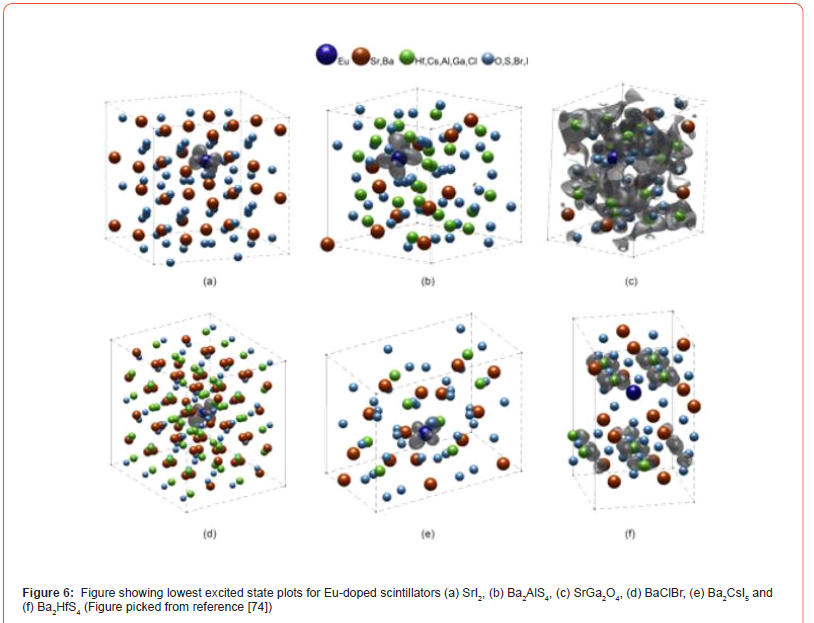 Density functional theory has been employed to study halide based scintillators. Sub-classes of halide-based scintillators studied include alkali-based halides, rare-earth and different dopant variants of these materials, see Figure 6 [66,67]. For a while alkali halide-based scintillators have been model systems and has paved ways for the fundamental understand of scintillator technology. Insight from studies of alkali halides have provided detailed understanding of point defects. Alongside point defect-related traps, the mechanisms of charge or exciton self-trapping are areas of paramount importance in scintillator physics. Recent research have reported several novel halide-based scintillators with excellent scintillation properties [68]. Specifically, the structural, electronic, and optical properties of CeX3 (X = Cl, Br) within the generalized gradient approximation. The lattice parameters and optical properties calculated are in good agreement with the experimental data [69]. The investigation further obtained the energy band structures and density of states and optical properties. Theoretical methods have also been employed in the study of defect in halides namely in calculating formation energies of iodide vacancy in SrI2 for different charge states [70]. The work successfully investigated optical trap depth, absorption transitions and thermal trap depth of the luminescence centers. Other theoretical investigations examined lanthanum-based halides like LaBr3 and LaCl3 [71]. These offer energy resolution of 2.6- 3.3% at 662 keV, however growing them is challenging. Efforts have also been made to investigate Eu-doped halides like BaI2, BaBr2, SrI2, SrBr2, CaI2 and mixtures of these compounds because of their scintillation properties. This investigation identified strontium iodide as readily growable.