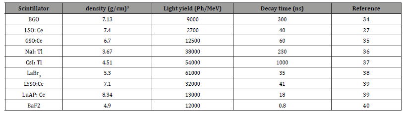 Early PET scintillators were based on the use of Sodium Iodide (NaI (TI)) crystals [26]. Discovered in 1948, it became the scintillator of choice owing to its high light output. It is efficient in the conversion of deposited gamma ray to scintillation photons [27]. This advantage notwithstanding, it is found to have low detection efficiency due to its low density and low atomic number. It is also found to be highly hygroscopic. These lead to active research in finding a suitable material as scintillator in PET.