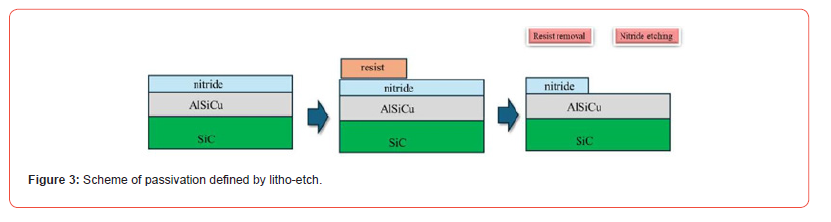 The trials have been done on MOSFET device built on SiC 4H substrate. Silicon nitride used as passivation layer is deposited on AlSiCu pad, the passivation layer is defined by std litho-etch processes. The etch step is performed by plasma based on fluoride, the process leaves trace of fluoride on the material exposed to the plasma, under certain environmental conditions F can be combined, for example with the air humidity, forming HF which can cause the metal corrosion.