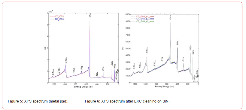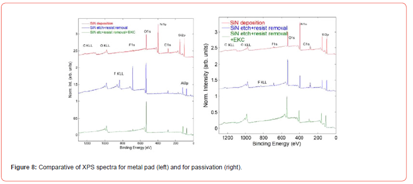 A small amount of F is detected by XPS even after the nitride deposition, then the analysis performed on two areas of the device, metal and passivation, show some differences related to the process steps.