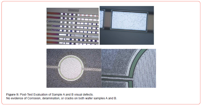 To evaluate the residual risk of metal oxidation and/or corrosion in the FAB process flow (see Pict. x, Scheme of passivation defined by litho-etch), two different wafer samples, A and B, were submitted to the 85/85 Humidity Test.