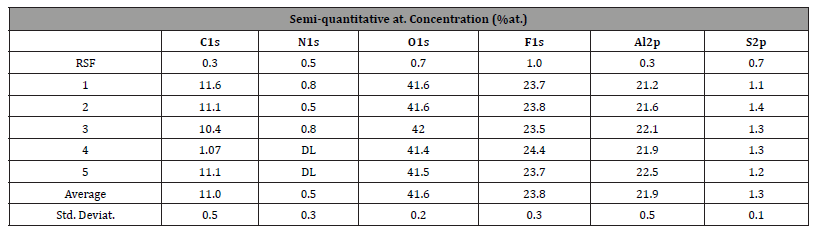 XPS provided quantitative insights into the elemental composition of device surfaces, with atomic percentage (%at.) calculations reflecting the relative abundance of specific elements. The results achieved on the AlSiCu surface show a relevant decrease in the F content after EKC treatment.