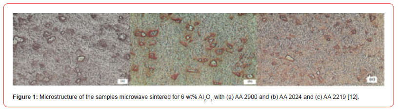Figure 1 shows the microstructure of the microwave sintered sample for 6 wt% Al2O3 with AA 2900 and AA 2024. Figure 1 (a) and (b) clearly depicts that ball milling has improved the homogeneous dispersion of the reinforcement particulates in the matrix. Very less porosity is being observed in the microstructure and irrespective of the metal matrix used. From Figure 1 (a) and (b), it is evident that reinforcement particles have bonded firmly with the matrix metal during microwave sintering process. From Figure 1 (c), it is observed that very less reinforcement particles are observed on the surface of the 2219 alloy composites. This is attributed that lesser diffusion of the reinforcement particulates into the matrix is obtained because of lack in Si content which leads to reduction in hardness and compressive strength of the composite [12].