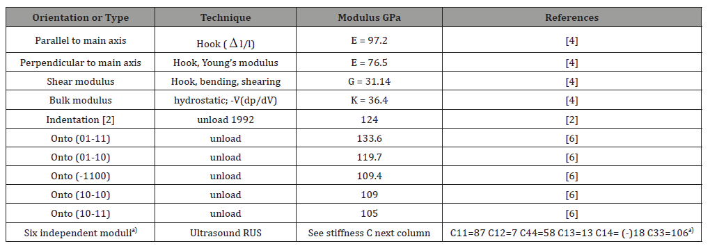 Table 1:Elastic Moduli of α-Quartz (trigonal with 6 independent Young’s moduli from Crystran’s Handbook at 106; 87; 58; -18, 13; 7 GPa, where C means stiffness = compliance C11=87 C12=7 C44=58 C13=13 C14= (−)18 C33=106 are the ultimate data from RUS (relaxation ultrasound spectroscopy).