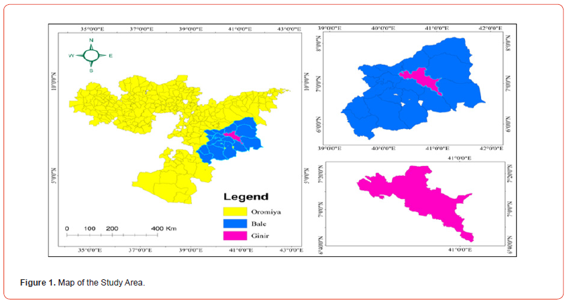 The study was conducted in the Ginir district, one of the Bale highlands in the Oromia Regional State, southeastern Ethiopia. Ginir is 519 km from Addis Ababa; Ginir is located at 07° 15′ North latitude and 40° 66′ East longitude between 1750 and 1986 meters above sea level (Figure 1). Seasonal rainfall is 531 mm and the average annual minimum and maximum temperatures are 13.4 and 25.5 °C, respectively [15]. The soil type is Vertisol. Ginir has a mono-cropping season (main season) that lasts from September to January. Ginir District is very favorable for cereal production, but also legumes, oilseeds, and horticultural crops produced by farmers.