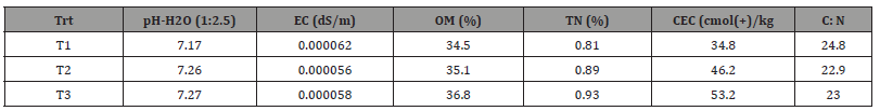 Where T1 = Parthenium compost + manure; T2 = Parthenium compost + crop residue, T3 = Parthenium compost + manure + crop residue