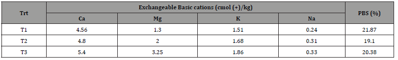 According to analysis, Ca, Mg, K, and Na exchangeable base values ranged from 4.56 to 5.40 mol (+)/kg, 1.30 to 3.25 mol (+)/ kg, 1.51 to 1.86 mol (+)/kg, and 0.24 to 0.33 mol (+)/kg, respectively (Table 2). The combination of wheat straw and manure with parthenium biomass produced the relatively highest values of exchangeable bases. The least valuable compost was made from parthenium biomass combined with animal manure and wheat straw. This outcome is consistent with the [28] conclusion. In general, compost made from Parthenium and manure combined was richer in exchangeable cations than compost made solely from manure. These results lend support to Amir and Fouzia’s [29] assertion that compost made from parthenium had significantly higher levels of exchangeable bases (Ca, Ma, and K). Compost made with mixed farmyard manure and biomass is obtained from Parthenium compost. The individual cations have been expressed as a percentage of the Effective CEC, according to [27] [24] registrations from Parthenium compost that show very high Ca, high to very high Mg, very low K, and low to low very Na according to [27-35].