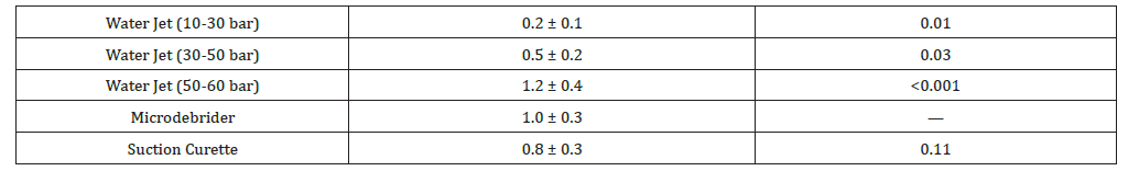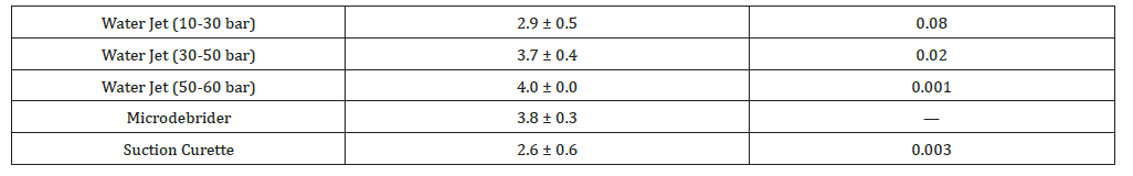 Best scores at 30-60 bar. No significant difference between high-pressure water jet and microdebrider (p = 0.32)