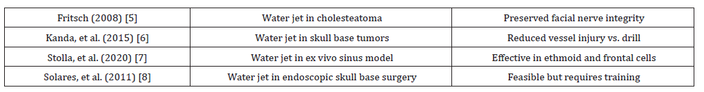 - Fritsch MH (2008) Endoscopic management of middle ear cholesteatoma using the water jet. Otol Neurotol 29(8): 1122-1129.
