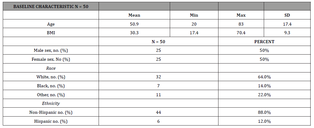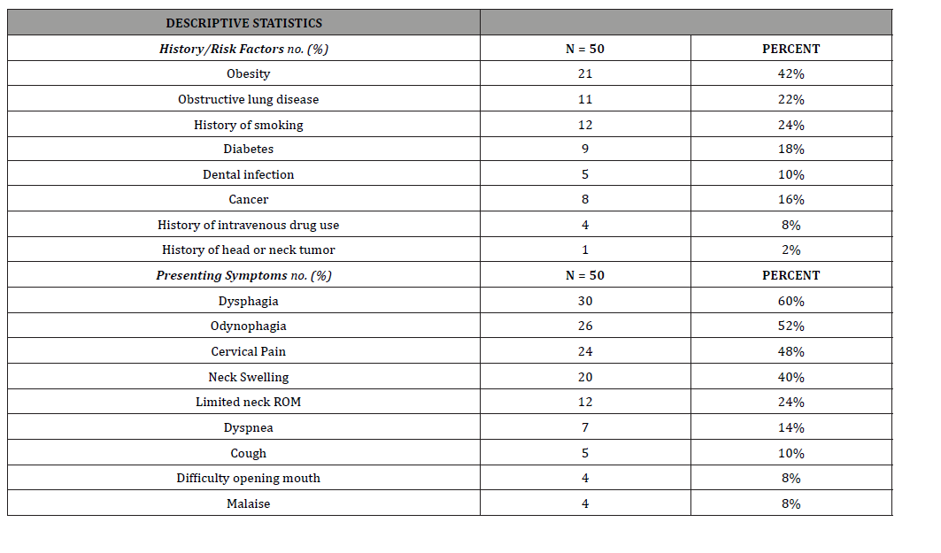 Results: Fifty adult patients were included. Risk factors included obesity, history of smoking, intravenous drug use, diabetes, and dental