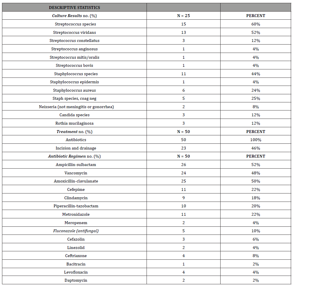 Cultures were obtained in 50.0% of patients, of these cultures 92.0% evidenced bacterial growth. Cultures most commonly grew streptococcal (60.0%) or staphylococcal (44.0%) species, as seen in table 3. Viridans group Streptococci were the most common organisms identified (52.0%). Other organisms included Staphylococcus Aureus (24.00%), Rothia Mucilaginosa (12.0%), and Neisseria species (8.0%). Candida species was identified in 12.0% of cases.